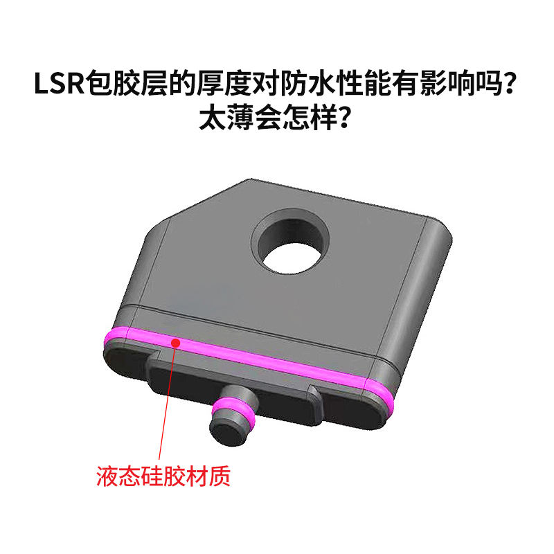 LSR(液態(tài)硅膠)包膠層的厚度對防水性能有直接且關(guān)鍵的影響—— 合適的厚度是防水密封的 “基礎(chǔ)屏障”,而厚度過薄會直接導(dǎo)致防水能力下降甚至失效,具體影響和風(fēng)險可從防水原理、實際使用場景拆解: