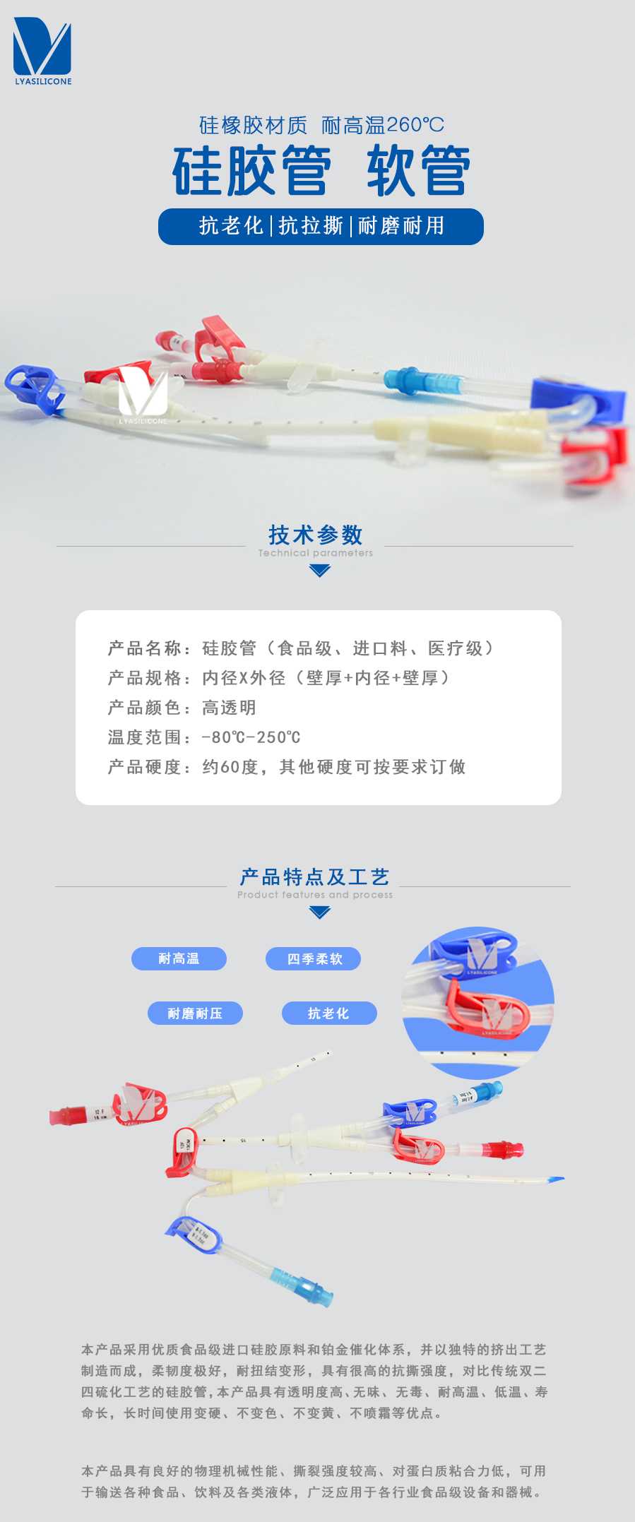 本產(chǎn)品采用優(yōu)質(zhì)食品級(jí)進(jìn)口硅膠原料和鉑金催化體系,并以獨(dú)特的擠出工藝制造而成,柔韌度極好,耐扭結(jié)變形,具有很高的抗撕強(qiáng)度,對(duì)比傳統(tǒng)雙二四硫化工藝的硅膠管,本產(chǎn)品具有透明度高、無(wú)味、無(wú)毒、耐高溫、低溫、壽命長(zhǎng),長(zhǎng)時(shí)間使用變硬、不變色、不變黃、不噴霜等優(yōu)點(diǎn)。